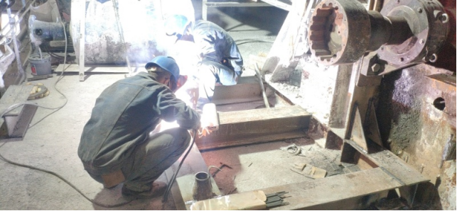 (8)回轉(zhuǎn)窯輪帶擋圈及墊板補焊加固,檢查大齒圈齒面磨損并對齒面打磨修復(未完成);