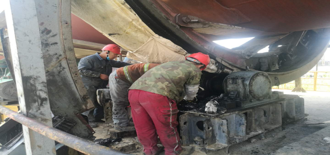 4月27日,此次回轉(zhuǎn)窯檢修已經(jīng)迎來了最后的沖刺階段。工作中最頻繁,最臟的,最累的工作任務莫過于回轉(zhuǎn)窯大齒輪更換機油及校正工作。