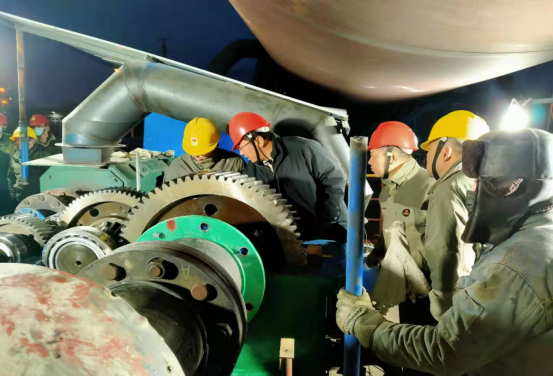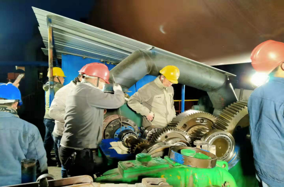 1月4日,塞北二九天氣,室外溫度已在零下16℃左右,傍晚夜幕降臨,員工們在燈火通明的回轉(zhuǎn)窯主減速機(jī)檢修現(xiàn)場,迎著寒風(fēng)刺骨,卻是熱火朝天,一派繁忙大干的景象。由于生產(chǎn)任務(wù)重,檢修時(shí)間緊,公司領(lǐng)導(dǎo)班子帶領(lǐng)員工克服種種困難,戰(zhàn)勝諸多不利因素,不畏嚴(yán)寒,加班加點(diǎn)趕進(jìn)度,爭分奪秒搶工期,積極推進(jìn)回轉(zhuǎn)窯主減速機(jī)恢復(fù)正常運(yùn)行。