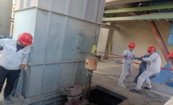 更換生料1909提升機(jī)鏈條和料斗現(xiàn)場:他們無懼“烤”驗 ,“汗”衛(wèi)設(shè)備有效運行。檢修中,他們手持焊槍,用一片赤忱,“汗”衛(wèi)設(shè)備長周期穩(wěn)定運行,在太陽曝曬下,設(shè)備溫度已達(dá)40℃左右,有限高溫作業(yè),一會兒焊接,一會兒切割,一會兒又是安裝……他們堅守一道道安全之門,即使皮膚曬得黝黑,汗水濕透衣衫,依然為的是安全生產(chǎn)穩(wěn)定保駕護(hù)航!