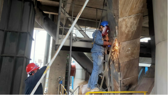 選粉機(jī)進(jìn)行補(bǔ)焊風(fēng)格輪,由于作業(yè)空間狹小,不好展開工作,他們克服困難,在保證安全第一的情況下順利完成檢修工作任務(wù)。