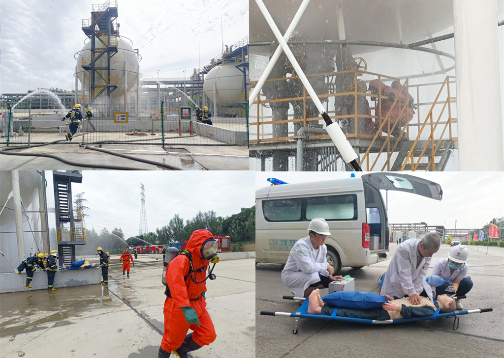 本次演練主要內(nèi)容是:2023年6月28日,金昱元廣拓能源有限公司2#罐區(qū)氯乙烯單體球罐發(fā)生泄露,在裝置處置過程中,搶修人員出現(xiàn)中毒癥狀,隨著泄露量的不斷增大,泄漏點突然起火,造成人員傷亡。在應(yīng)急指揮部的科學決策、正確指揮下,經(jīng)過廣拓能源公司及多方應(yīng)急救援力量的協(xié)同配合下,這一起危險化學品泄露燃爆事故最終得到了成功處置。