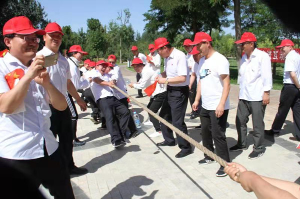為豐富活動形式,增強黨員的交流互動,放松緊張的工作情緒,活動結(jié)合學黨章黨規(guī),組織開展了黨的知識答題接力賽和拔河比賽。拔河比賽中,三個支部選拔精兵強將,循環(huán)比賽。經(jīng)過激烈比拼,資源再生公司黨支部獲得第一名,公司黨委為優(yōu)勝隊頒發(fā)了紀念品。