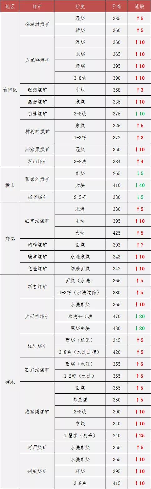 榆林煤價(jià)繼續(xù)漲:18家煤礦上調(diào)價(jià)格5-10元/噸 周末至今,榆林18家煤礦又上調(diào)價(jià)格。據(jù)榆林煤炭交易中心數(shù)據(jù)顯示,截止目前,榆陽(yáng)區(qū)(6000k 0.6S)動(dòng)力煤均價(jià)為357元/噸,環(huán)比上漲6元/噸;神木(5800k 0.4S)動(dòng)力煤均價(jià)為339元/噸,環(huán)比上漲5元/噸;府谷(5500K 0.4S)動(dòng)力煤均價(jià)為322元/噸,環(huán)比上漲7元/噸。 最新調(diào)價(jià)煤礦: