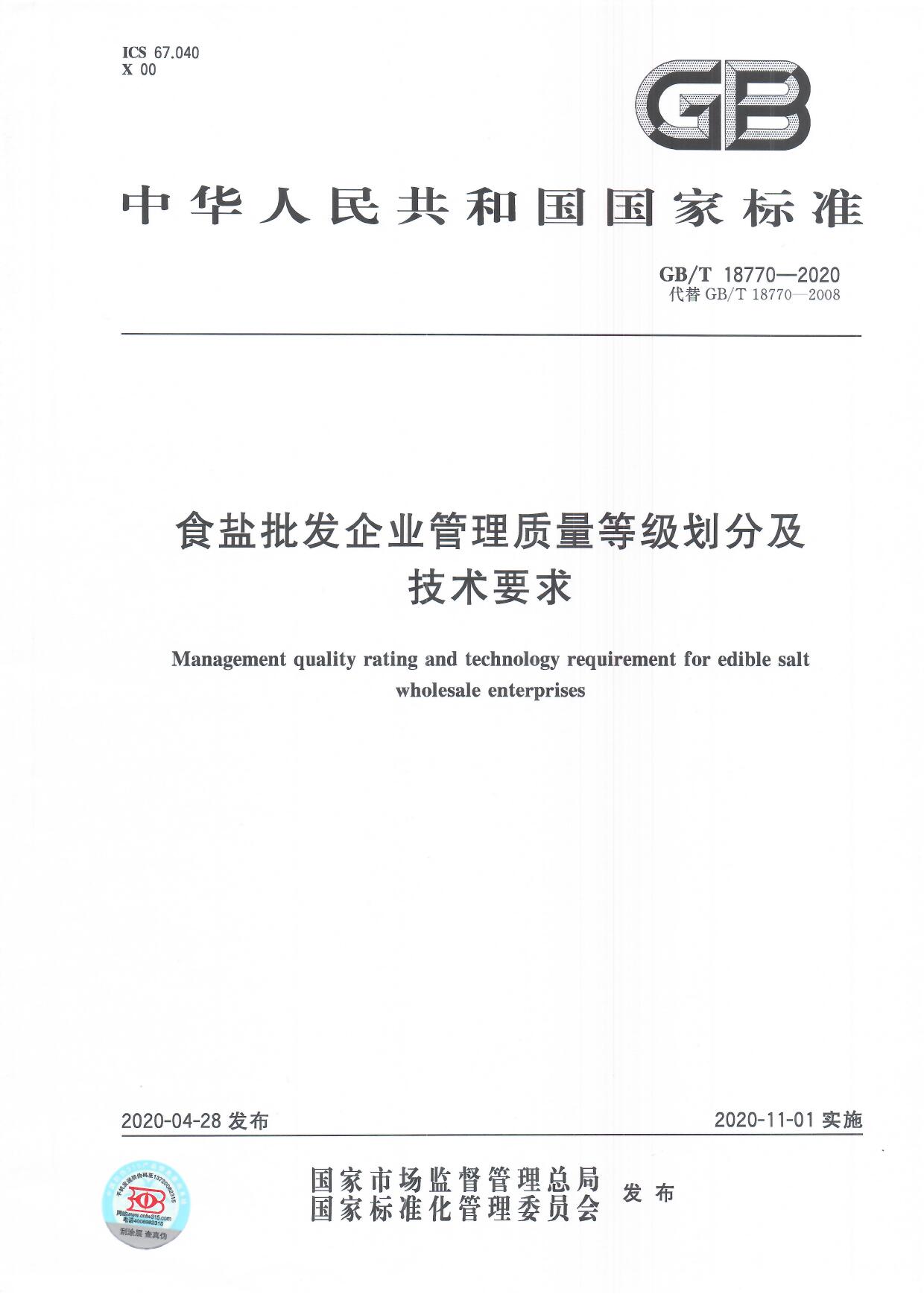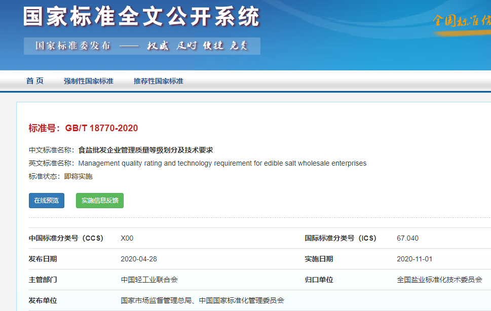 食鹽批發(fā)企業(yè)管理標(biāo)準(zhǔn):GB/T 18770-2020
