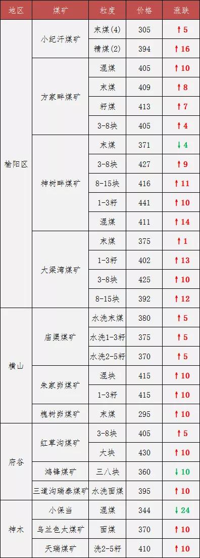 據(jù)榆林煤炭交易中心數(shù)據(jù)顯示,現(xiàn)在榆陽區(qū)(6000K 0.6S)標準煤均價已漲至399元/噸,神木(5800K 0.4S)標準煤均價漲至385元/噸,府谷(5500K 0.4S)標準煤均價漲至355元/噸。