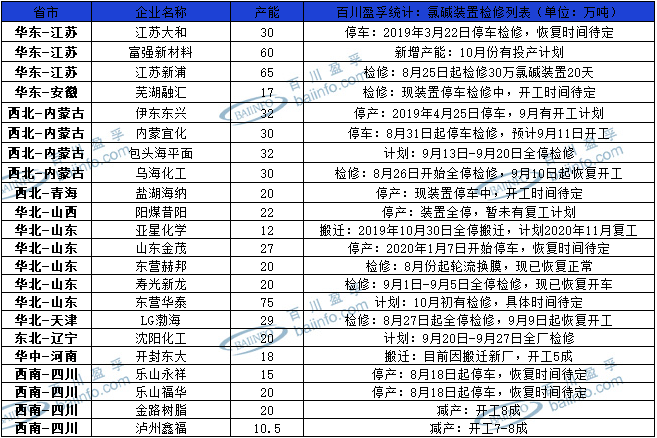 進(jìn)入9月份我國氯堿裝置開工情況較為平穩(wěn),氯堿檢修企業(yè)較少,開工率維持在78%-81%之間。截止9月10日,中國氯堿裝置具體檢修情況如下圖: