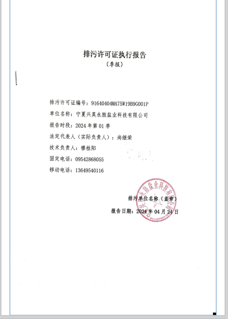 寧夏興昊永勝鹽業(yè)科技有限公司2024年第1季度排污許可執(zhí)行報(bào)告